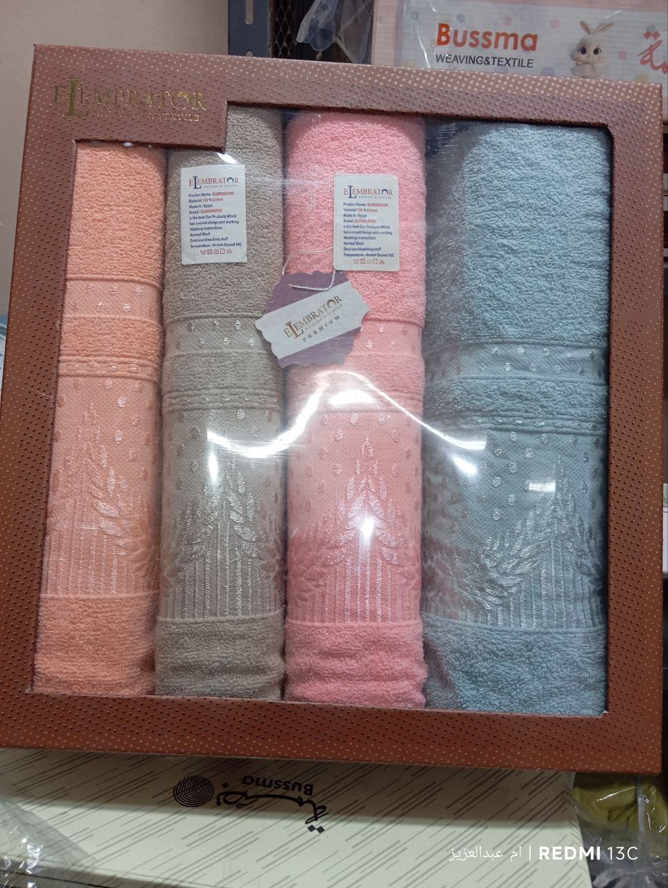 طقم فوط فاخر (4 قطع) بجودة عالية من القطن الناعم. يتميز بامتصاص ممتاز، ملمس ناعم، وتصميمات عصرية تضيف لمسة أناقة للحمام أو الاستخدام الشخصي. مناسب كهدايا أو للاستعمال اليومي.